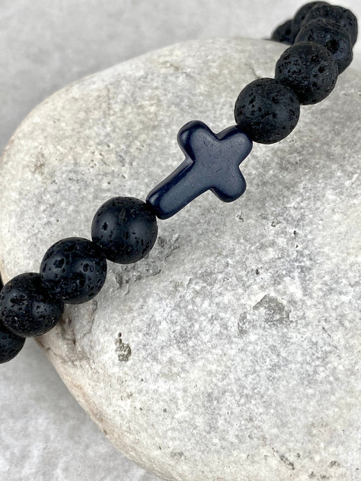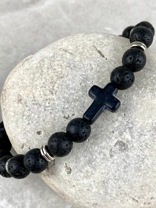 Black Volcanic Lava Rock Stone Bracelet with CrossBlack Volcanic Lava Rock Stone Bracelet with Cross