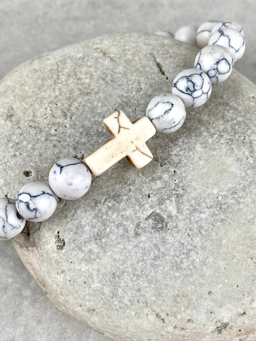 White Howlite Beaded Bracelet with Cross MB5White Howlite Beaded Bracelet with Cross MB5